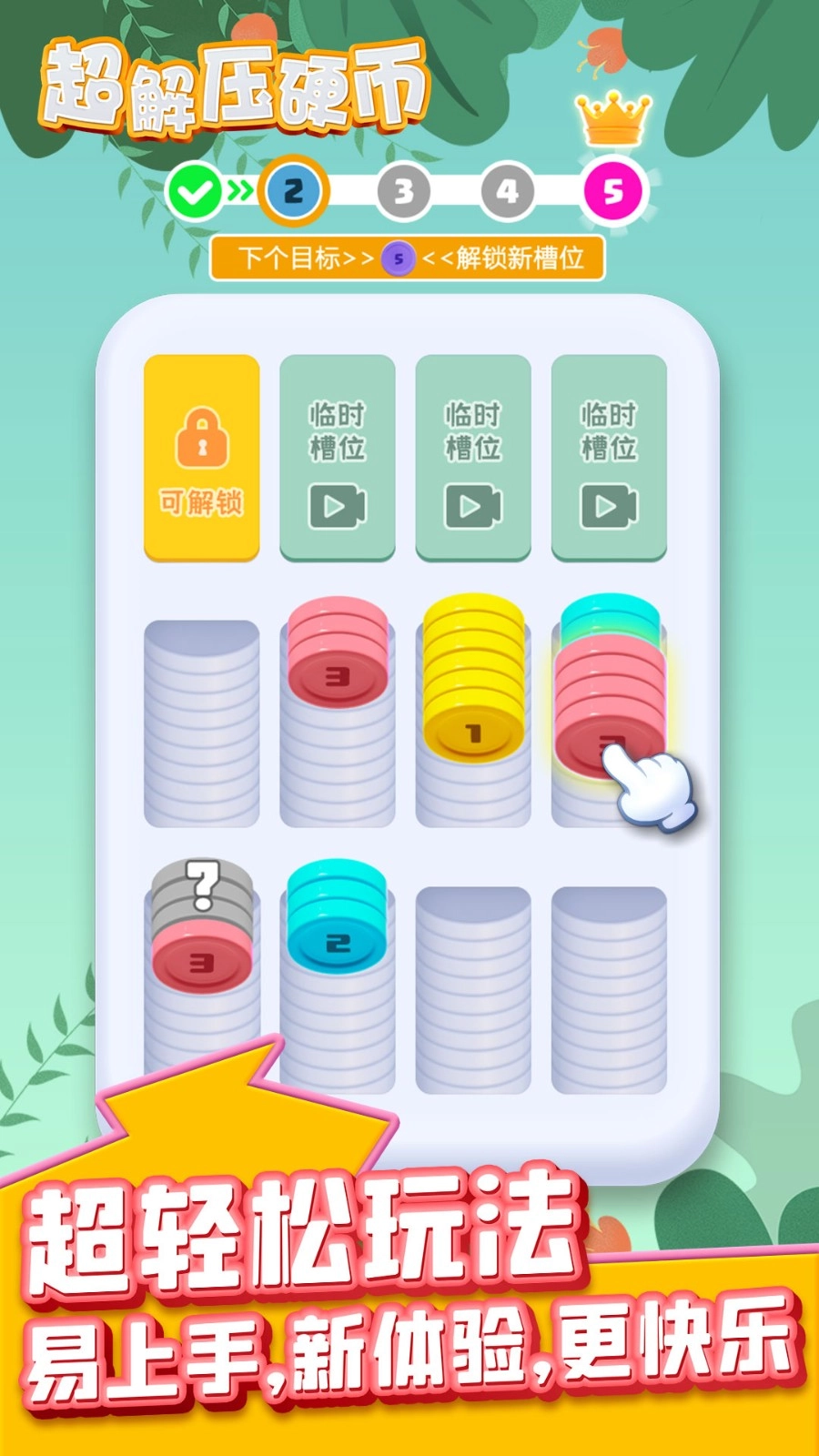 超解压硬币是一款十分有趣的休闲解压游戏。在游戏里,玩家需要巧妙点击硬币,让它们移动到不同槽位来完成合成消除——相同颜色的硬币组合就能消除并获得分数。游戏从简单的入门关卡和玩法起步,难度会逐步提升,即使是纯新手也能慢慢掌握各种技巧与策略,不断提升实力、推进闯关。不过,移动硬币时要留意整体布局,做好规划,这样才能最大程度完成挑战、获取奖励。游戏设计了丰富的难度级别和多样的关卡形式,玩家需随时做好准备,快速规划以应对挑战,遇到任何危机或麻烦都要及时解决。喜欢这类游戏的朋友快来体验吧,可别错过了!
