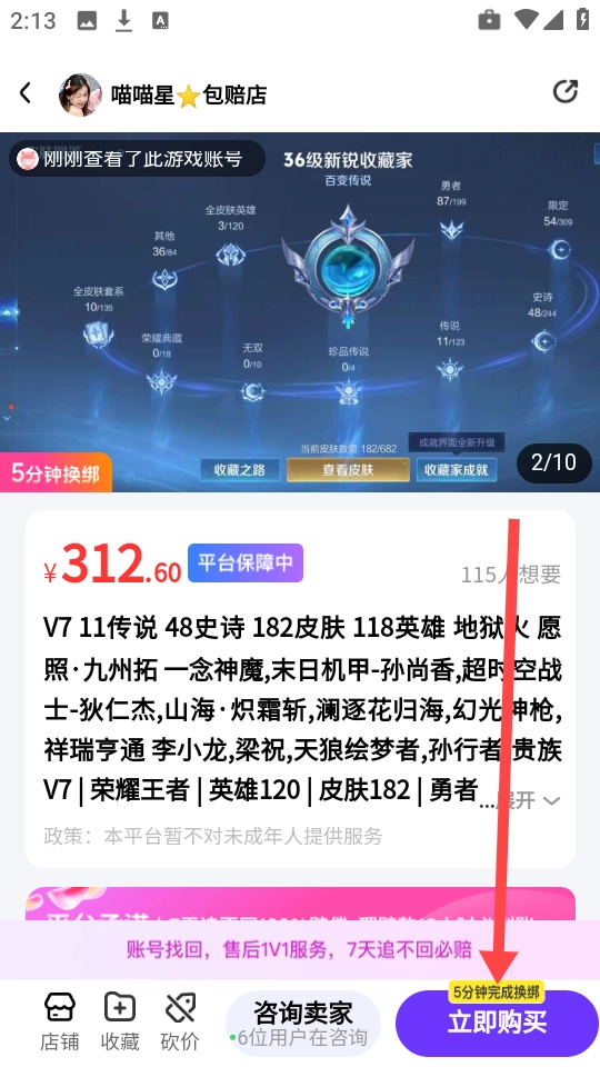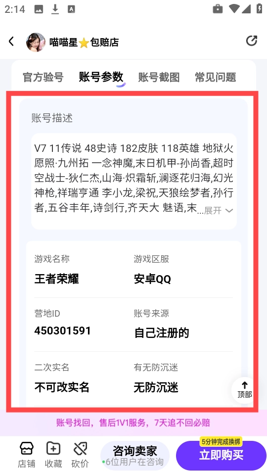 浏览并挑选一个合心意的游戏账号,点击“立即购买”按钮就能启动购买流程。