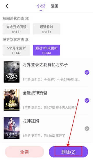 利用上方筛选工具,挑选需要删除的小说或漫画项目。