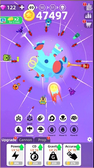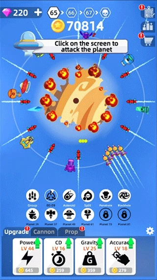 通过摧毁更多星球来获取更丰厚的金币,再用这些金币升级你的武器与技能,这样就能去摧毁那些最大的星球了。