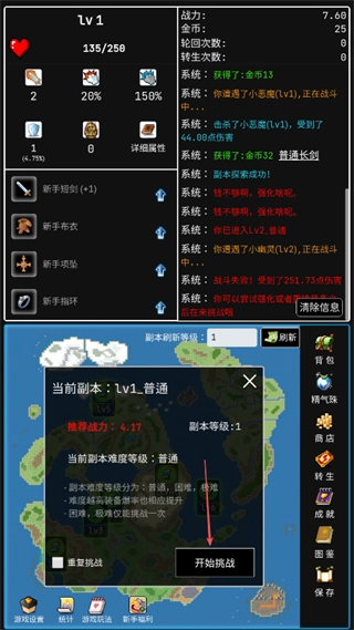 点击地图上的刷新按钮,更新副本区域,挑选合适的副本(比如Lv1_普通)准备挑战。