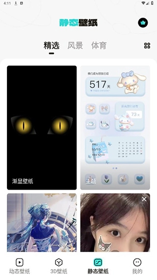 用户点击下方静态壁纸,可以进行静态壁纸的设置,有精选、风景、体育三大类可以设置。