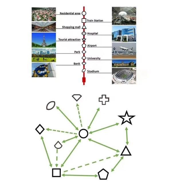 始发站与终点站均为住宅区(标识为圆形),第二站是商业区(标识为三角形),线路中途会经过交通枢纽。