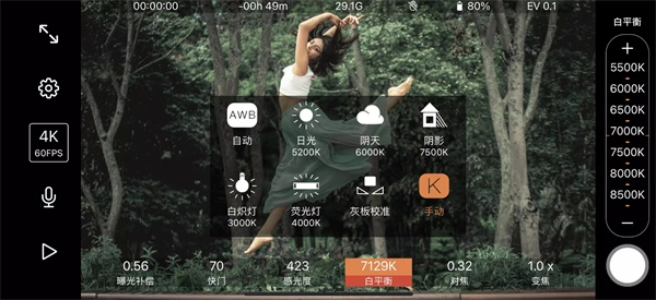 1、具备独立设置的“测光点”与“对焦点”,支持曝光补偿功能 2、可手动控制或锁定以下参数: - 快门速度与感光度(ISO) - 色温 - 对焦 此外还提供预设白平衡选项