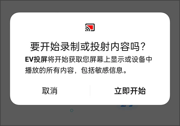 点击【立即开始】按钮即可启动投屏功能,若需退出投屏,点击【取消】按钮即可。 EV投屏的核心优势: 1. 提供多样化的连接方式供您选择 安卓设备既可以通过在Windows系统中搜索投屏功能来连接,也能够采用扫码的方式完成投屏操作。