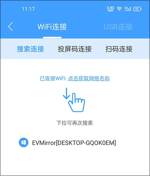 1.2 搜索连接 系统会自动查找同一WiFi网络环境下能够连接的设备,若需重新搜索,可通过下拉列表操作。