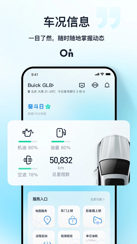 1、可远程操控车门锁的开启与关闭; 2、能够查看车况相关信息,例如机油剩余寿命、车辆行驶里程等; 3、具备远程启动车辆的功能。