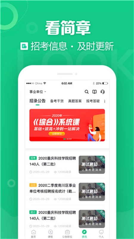 1、【招考资讯】 第一时间同步招考公告,各类考试资讯全掌握。