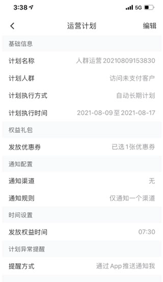 3、新建人群运营列表 在人群运营列表页面,点击右上角的“新建计划”按钮。依次填写基础信息,选定计划对应的人群、计划的执行方式以及计划的执行时间。接着设置优惠券权益,优惠券允许同时选择多个,且每种优惠券的单次发放上限为10张。之后确定权益的发放时间。待所有设置项均配置完成后,即可完成计划的创建。