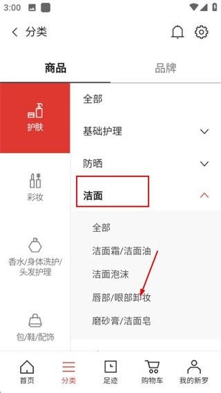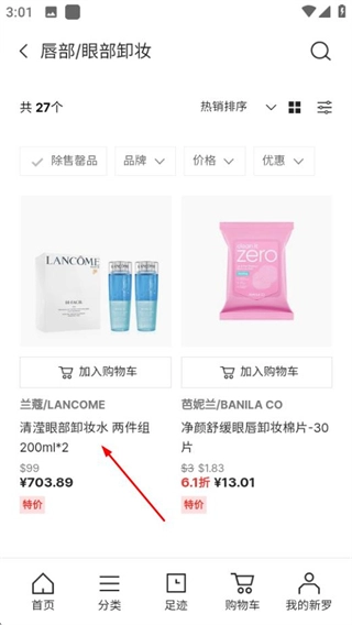 在商品分类页面,挑选商品类别(比如唇部眼部卸妆类),就能进入到商品列表页面。