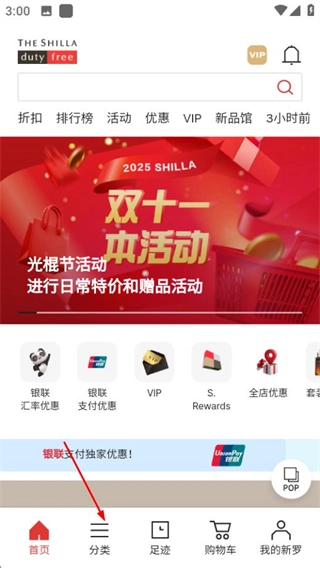 在新罗免税店的首页,点击页面底部的分类选项,即可进入商品分类页面。