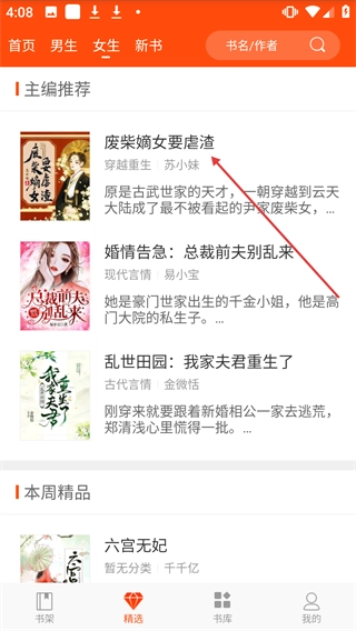 在女生频道的主编推荐里,找到《废柴嫡女要虐渣》并点击,就能进入这本书的详情页面啦。