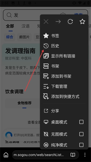 在展开的功能菜单里点击【历史】选项,即可进入历史记录界面。