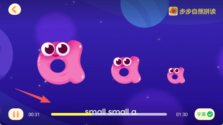 进入字母学习阶段后,通过观看相关的动画视频,来学习字母的发音。