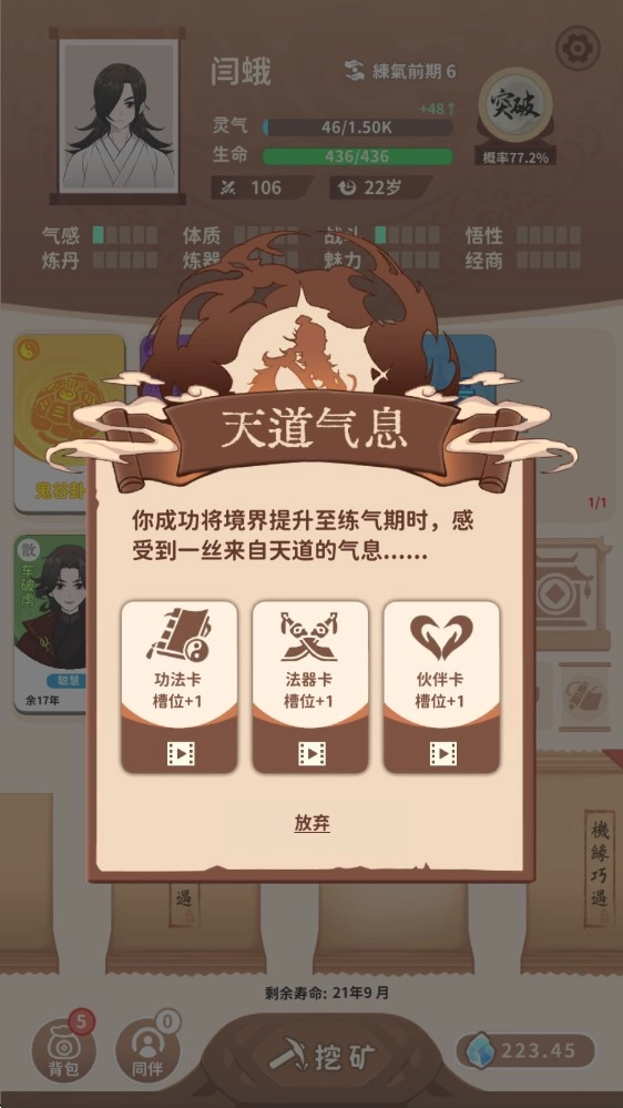 6、突破过程中,还会随机触发各类事件,比如这里出现的天道气息便是其中之一。