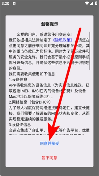 打开交运安应用,当弹出隐私政策温馨提示窗口时,点击“同意并接受”按钮。
