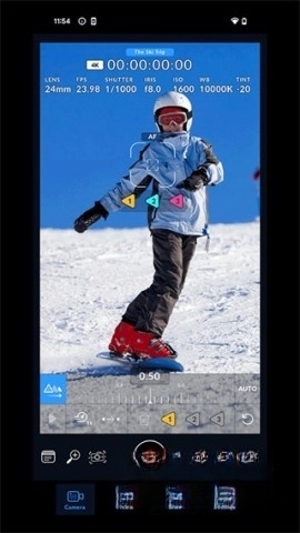 在拍摄界面,只需在屏幕中央上下滑动手指,就能切换HUD(抬头显示器)的显示或隐藏状态。HUD可呈现帧率、快门角度、ISO、白平衡、时间码等关键参数,并且这些参数都支持交互操作——点击对应的数值或图标,就能调出菜单或滑块来进行设置调整。