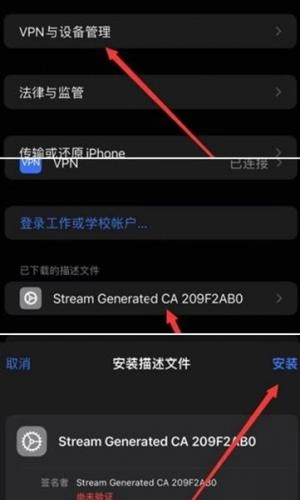 依次在手机里完成这些操作:先安装CA证书,接着打开设置,找到VPN与设备管理选项,最后点击刚才的文件进行安装。