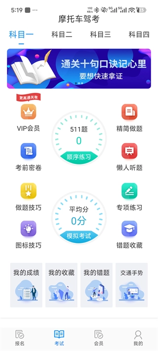 考试板块:启动摩托车驾考应用后,点击进入考试板块,这里设有科目一到科目四的学习入口,配备了VIP会员专属内容、精简刷题等功能,同时还提供辅助工具、模拟考试以及错题收藏等实用功能。