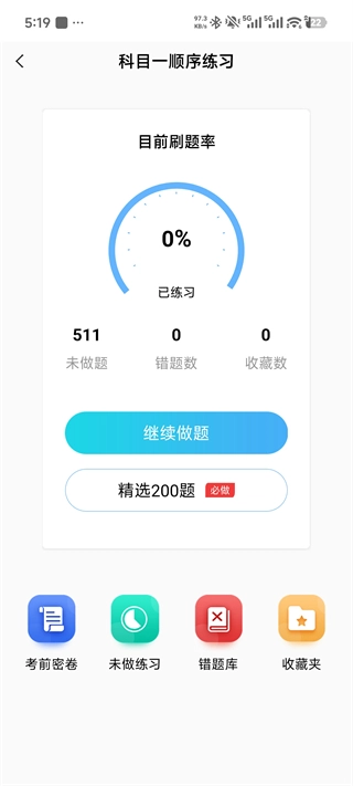 顺序练习:在科目一练习过程中,能够查看刷题的进度情况,既可以选择继续做题,也能挑选200道精选必做题来练习,同时还能利用考前密卷以及错题库,从而有针对性地提升自己的薄弱环节。