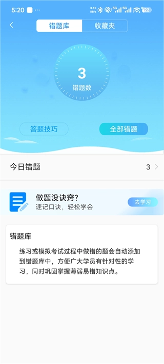 错题库功能:系统会自动统计用户做错的题目数量,支持查看所有错题记录,还能学习对应的答题技巧,帮助用户有针对性地突破知识薄弱点,从而提高答题的正确率。