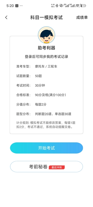 模拟考试:科目一模拟考试含 50 道题,可利用考前秘卷进行冲刺练习,帮助熟悉考试节奏,确保顺利通过考试。