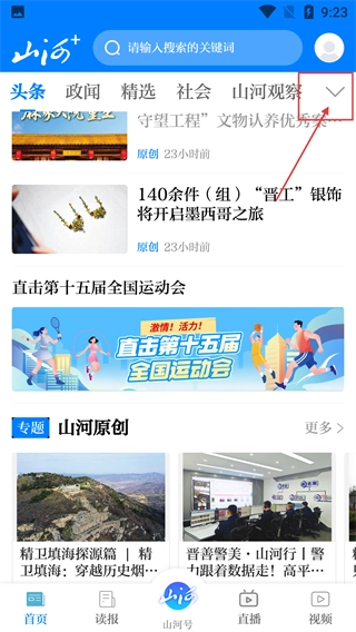在【山河+】首页顶部导航栏的右侧,点击下拉箭头按钮,就能展开全部栏目选择界面。