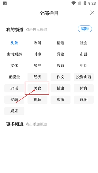 在所有栏目页面里,找到并点击【美食】频道选项,就能切换到美食类内容专区。