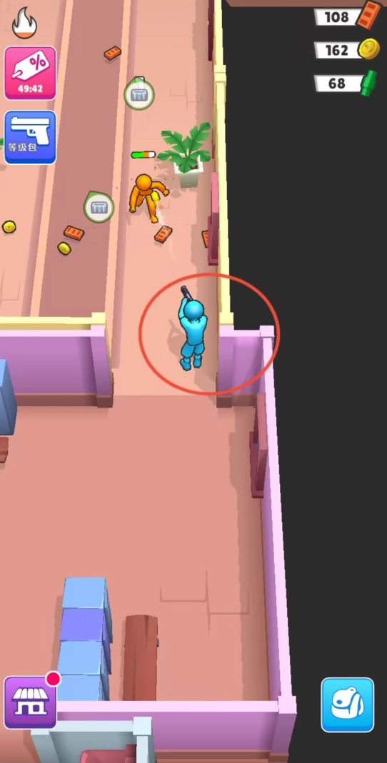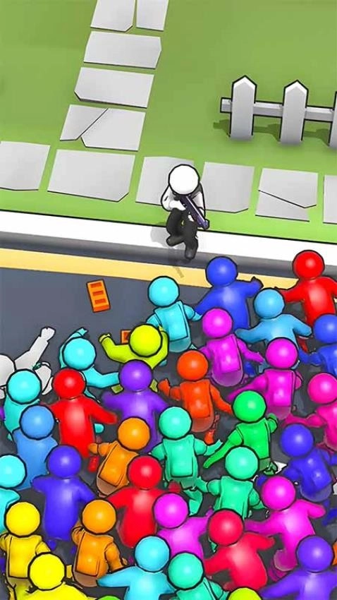长按屏幕来控制角色移动,当角色靠近敌方单位时会自动发起攻击,成功击败敌人后能获取相应颜色的资源材料,这些材料可用于后续的建造和升级操作。