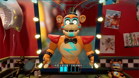 6、弹簧陷阱结局(真结局):6点之后使用派对券开启另一条分支路线,解锁所有能力。随后通过赛车场的旧电梯抵达6代店铺,启动发电机后,借助地面的破洞前往弹簧陷阱的复活地点。此时弹簧陷阱会一边入侵Freddy的系统,一边召唤另外三个Glamrock玩偶协同攻击,熔熊也会用触手发起袭击。你需要利用按钮焚烧弹簧陷阱,成功后它会被熔熊吞噬,你和Freddy逃离现场,在山坡上一同欣赏日出。