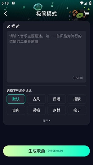 比如开启极简模式就十分便捷,只需在文本框中输入歌曲相关的描述关键词,选定想要的歌曲风格,接着点击下方的生成歌曲按钮即可。