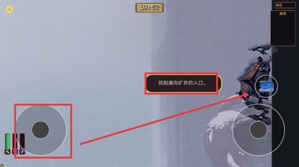 2、借助左下角的虚拟摇杆来操控角色移动,按照提示完成【找到通往矿井的入口】这一任务,探寻能够获取资源的场所。