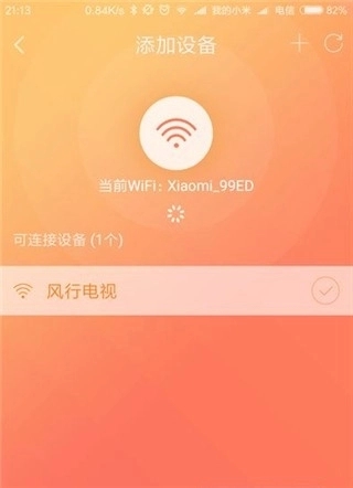 2、点击进入链接,进入“添加设备”页面后,选择处于同一WIFI环境下的智能电视,接着点击搜索到的电视名称(仅支持风行电视,其他品牌可能存在兼容性问题)。