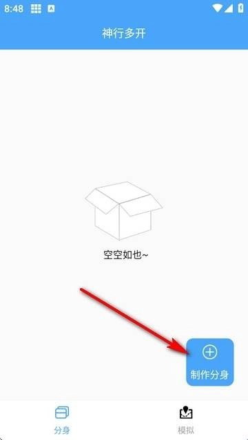 1、打开神行多开备用App,点击首页的 【+】按钮