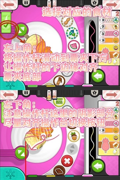 按照客人的需求,挑选对应的模具和食材,当小箭头移动到菱形方块处时,点击按钮使其停下。