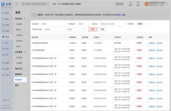已报商品一站管理功能支持按商品查询所有历史活动报名记录,爆款活动参与信息清晰明了;4、活动费用查询管理功能支持对营销活动收费进行查询管理,可及时缴费避免遗漏,明细查询与开票操作也更便捷。