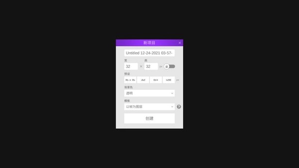 首次启动软件时,左侧会弹出新建窗口,点击“新建”后右侧会出现建立工程的界面。在这里可依次设置工程名称、画布尺寸(普通版最大支持1024*1024)、预设尺寸(系统已提供)、背景板颜色;“template”意为样板,包含动画样板、图层样板和基础字体的设置(设置后会生成96帧动画,实际用途不大)。完成上述设置后,点击“创建”即可开始绘画。