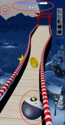 2、选定模式后通过触屏滑动控制球体移动,界面顶部实时显示关卡进度与暂停功能按键。