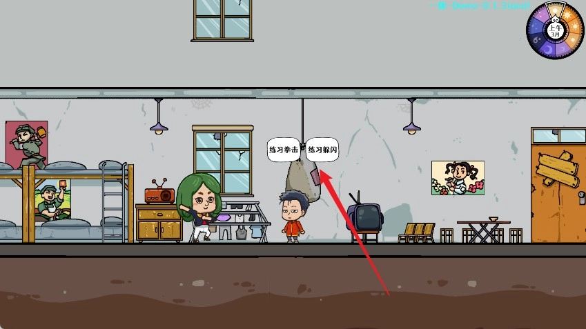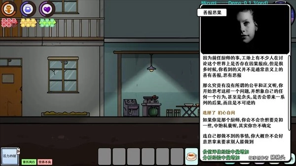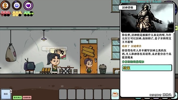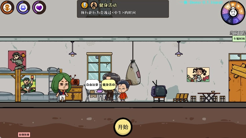 场景中与物品交互、提升属性都会消耗相应的体力/脑力/心力,并使右上角的时间推进一小格。