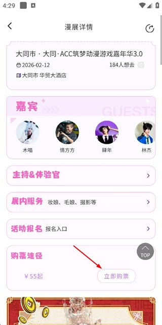 在漫展详情页面点击“立即购票”按钮,即可进入购票选择页面。
