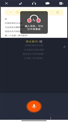进入素材页面后,佩戴好耳机,点击下方的麦克风图标开始录音,录音结束后,点击右上角的对勾按钮完成保存。