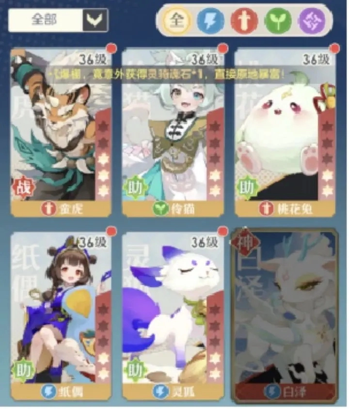 阵容推荐:蛮虎(主)+伶猫(助)+桃花兔(助)+纸偶(助)+灵狐(助)