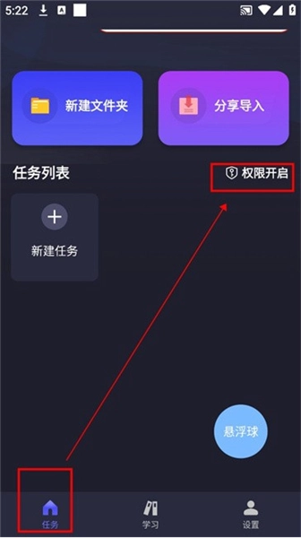 3.正式进入软件后,先在【任务】区进行权限授予操作,点击“权限开启”按钮。