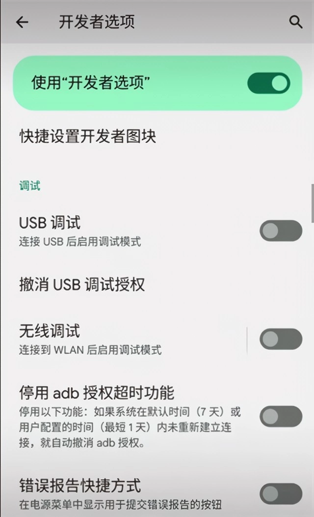 4、打开后回到开发者选项界面,接着开启无线调试功能。