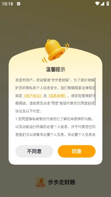 1:打开步步走财路应用,仔细阅读温馨提示内容后,点击界面上的橙色“同意”按钮,即可进入应用主界面。