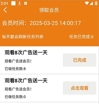 会员的领取方式如下:用户可通过观看广告免费领取,登录后进入【我的】页面,点击【领取会员】即可。