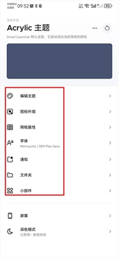 在主题页面中,你能够自主对主题、图标外观、字体以及小部件的功能进行编辑。