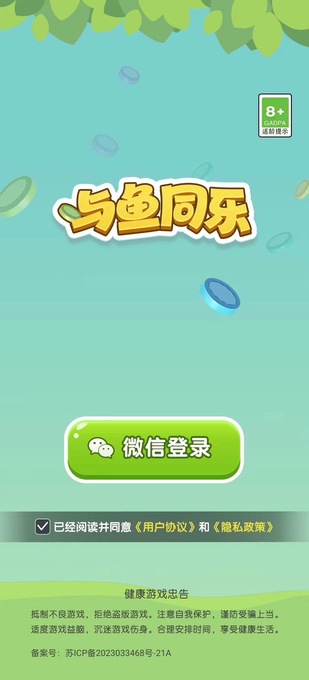 1、启动与鱼同乐游戏,勾选相关协议后,选择【微信登录】选项
