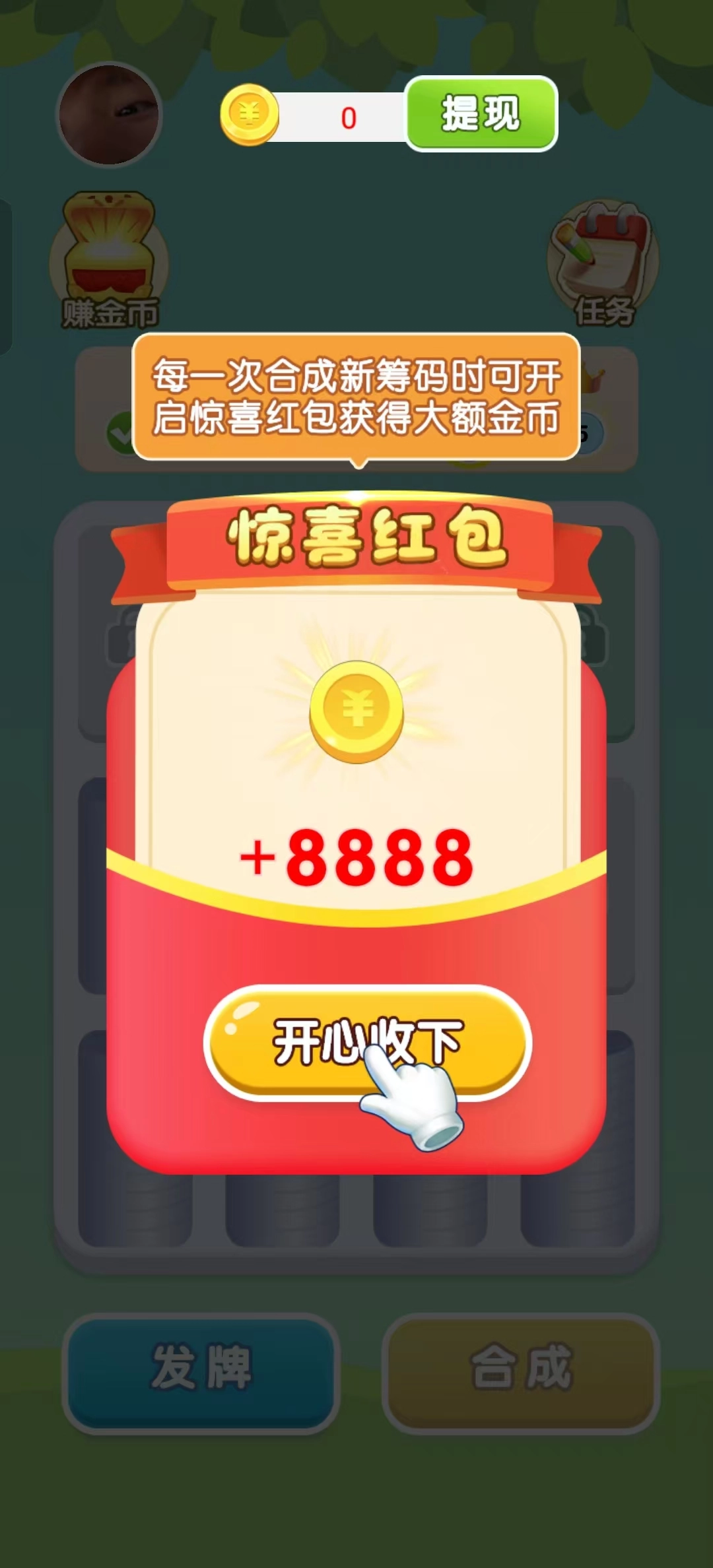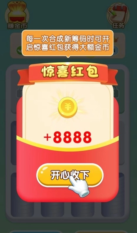 3、每次合成都会累积奖励,合成次数越多,收获也就越丰厚。(每次合成出新筹码时,还能开启惊喜红包,赢取大额金币哦)