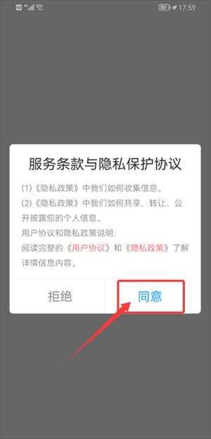 1、打开应用后,在服务条款和隐私协议页面点击同意按钮即可进入